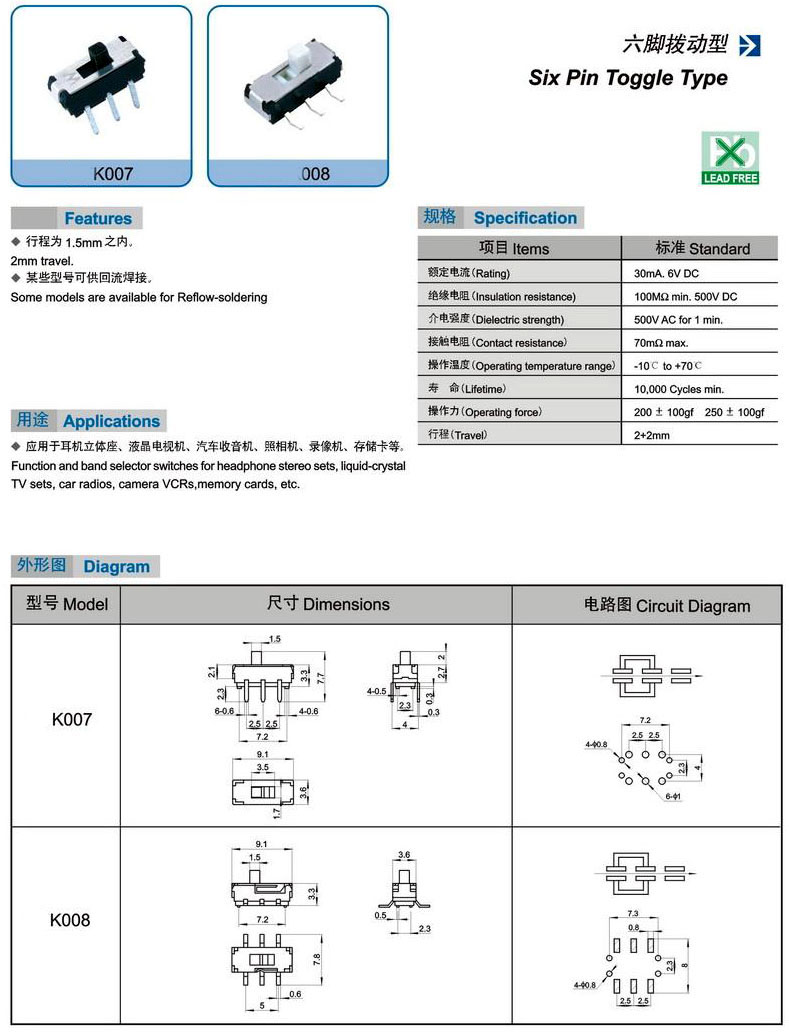 K007 K008(Six Pin Toggle Type)六腳撥動(dòng)型